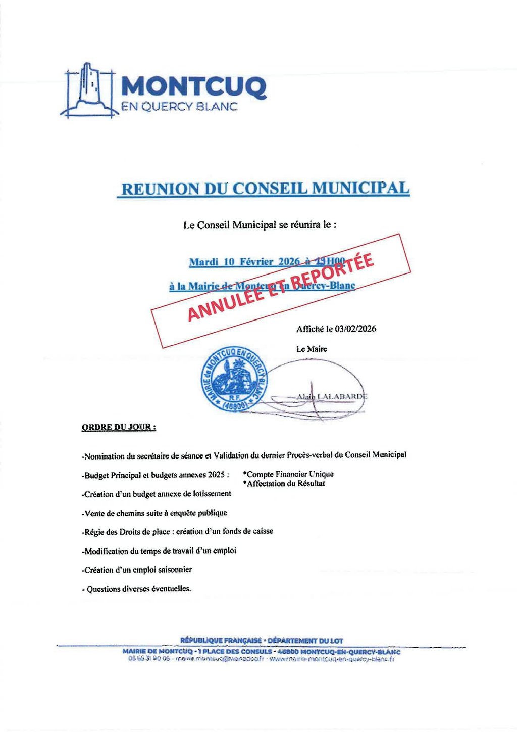 A titre exceptionnel la réunion du Conseil Municipal prévue du 10 Février 2026 est annulée et reportée.