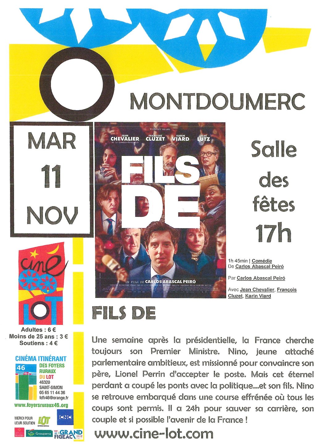 La municipalité en partenariat avec Ciné Lot vous propose la projection du film "Fils de", le mardi 11 novembre 2025 à 17 h 00 à la salle des Fêtes de Montdoumerc.