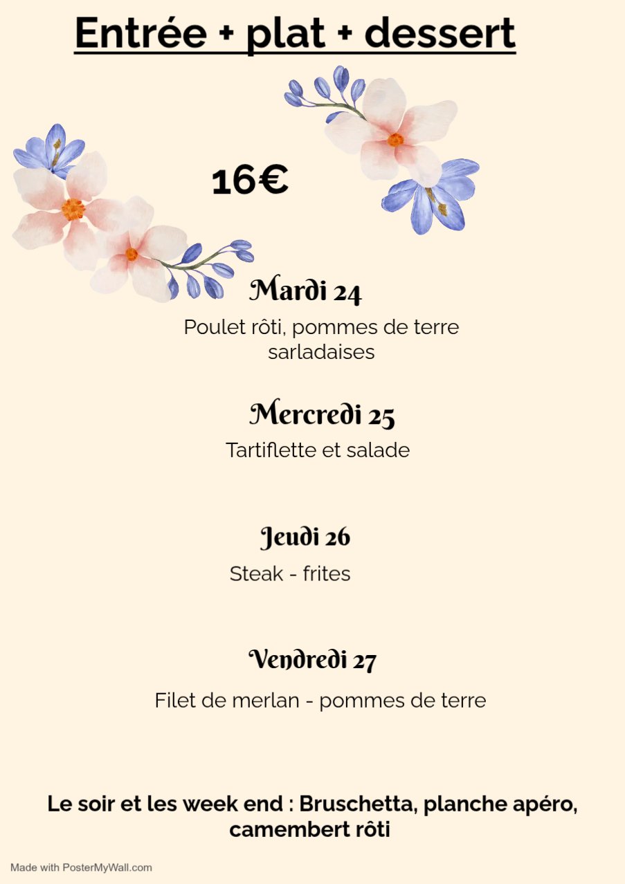 Le Montdoubar, café restaurant multi-service vous propose son menu de la semaine du 24 février au 1er mars 2026.