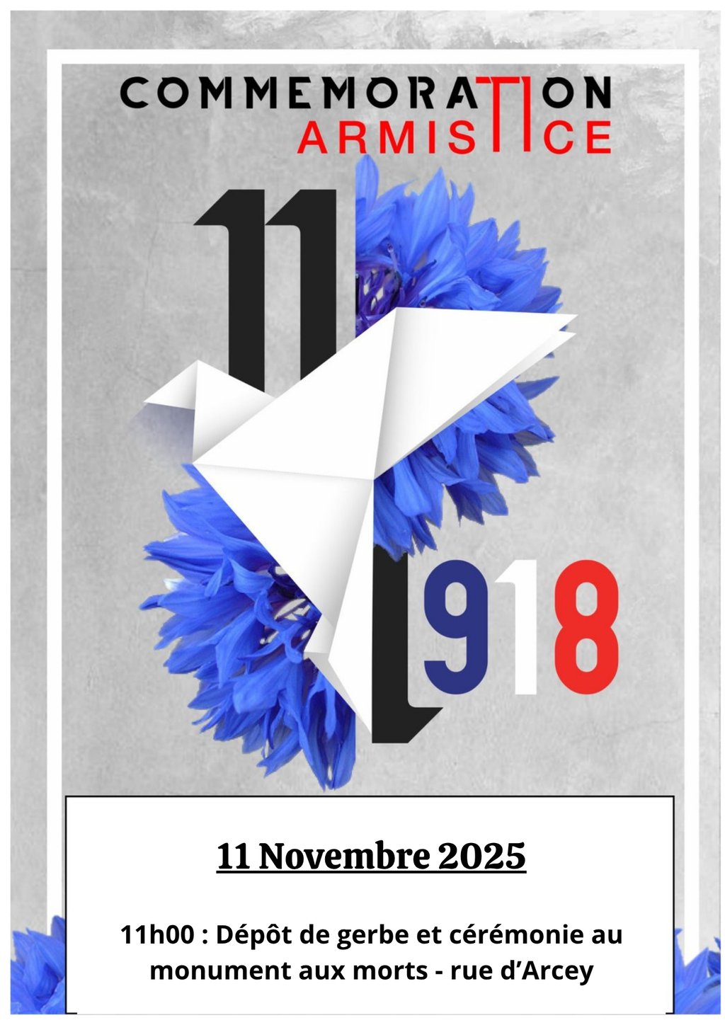 Nous vous donnons rendez-vous mardi 11 novembre à 11h00 au monument aux morts près de l’école élémentaire pour célébrer le 107ème anniversaire de la signature de l'Armistice de 1918.