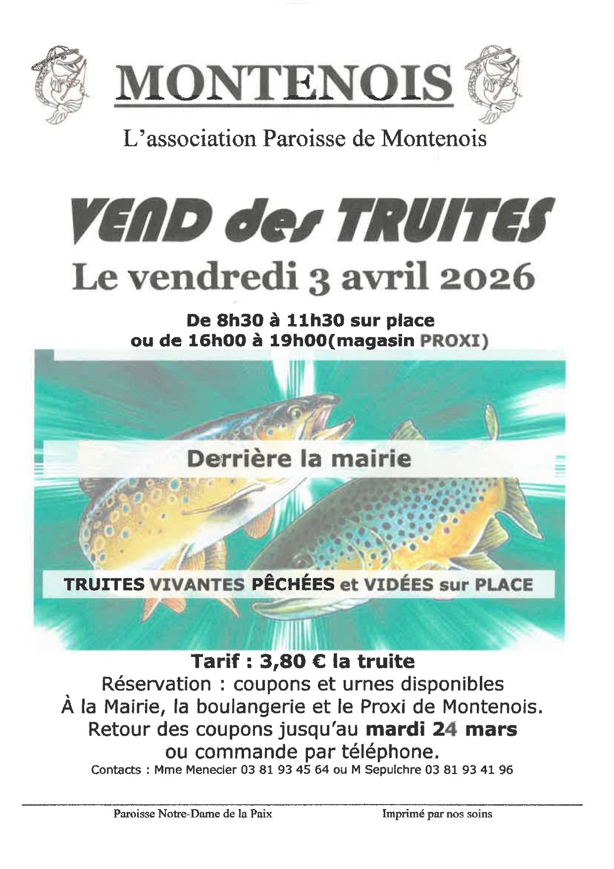 L'association Paroisse de Montenois organise sa vente annuelle de truites le vendredi 3 avril 2026.