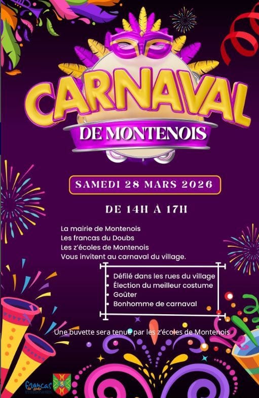 Le carnaval de Montenois se tiendra ce samedi 28 mars 2026 de 14h00 à 17h00.