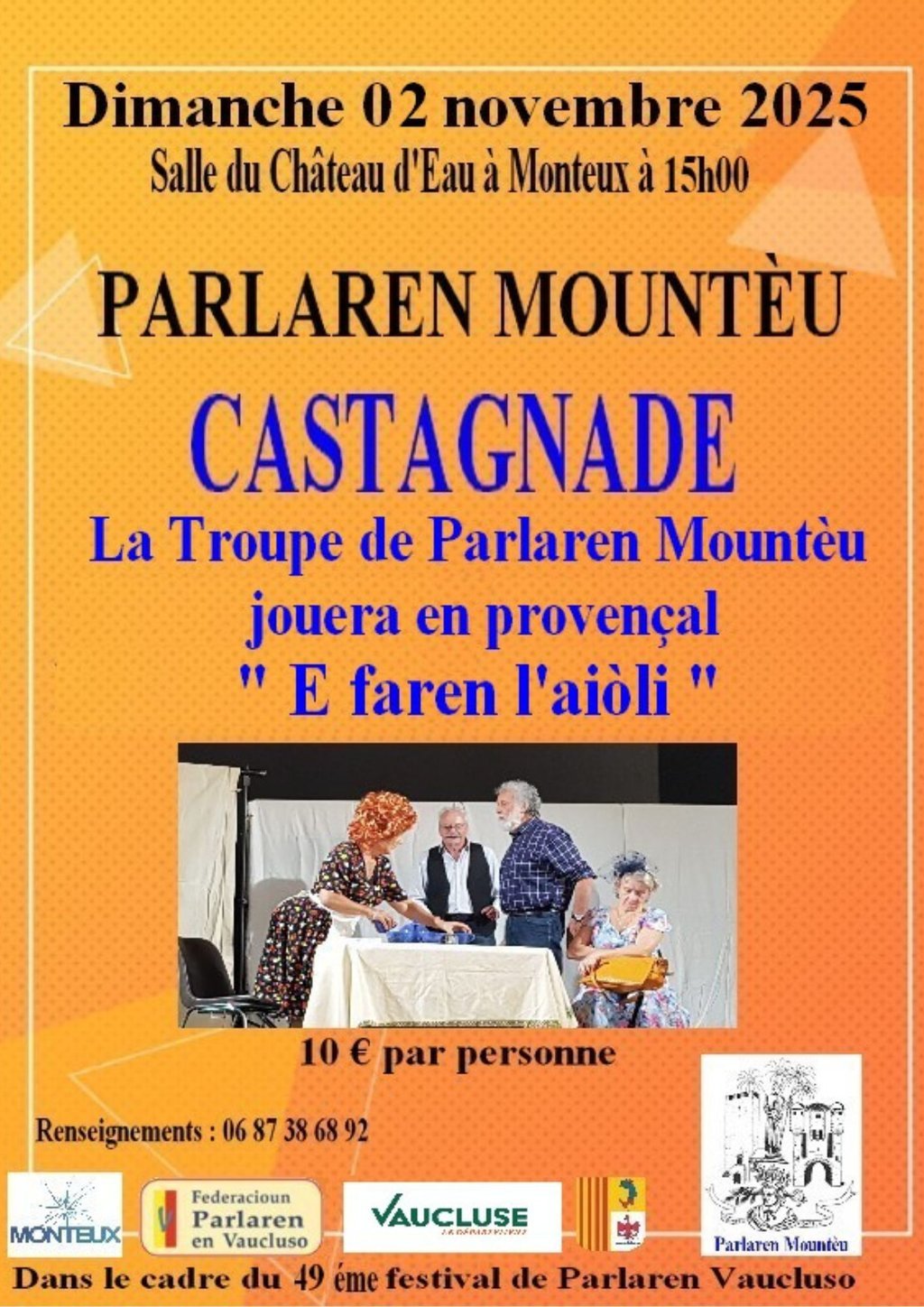L'association Parlaren Mountèu vous présente "La Castagnade". À 15H, la pièce “E faren n’aioli” et à 16h chataignes chaudes, boissons et biscuits.  Tarif : 10 € à la salle des fêtes du Château d’Eau. Billetterie sur place. Infos au 06 87 20 58 22