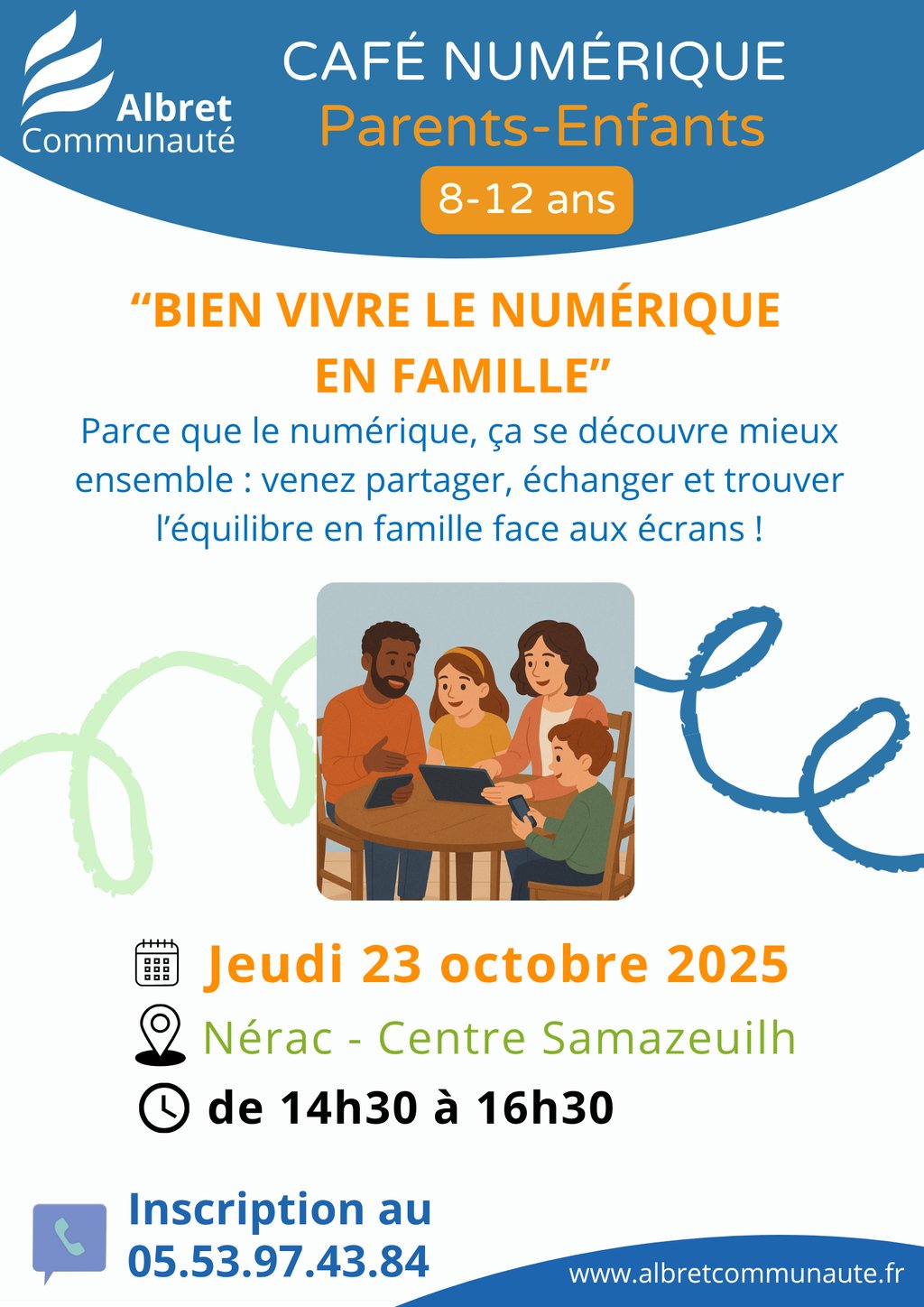 Albret Communauté vous informe qu'un café numérique sera proposé aux parents et aux enfants âgés de 8 à 12 ans au Centre Samazeuilh à Nérac, le jeudi 23 octobre prochain de 14:30 à 16:30.