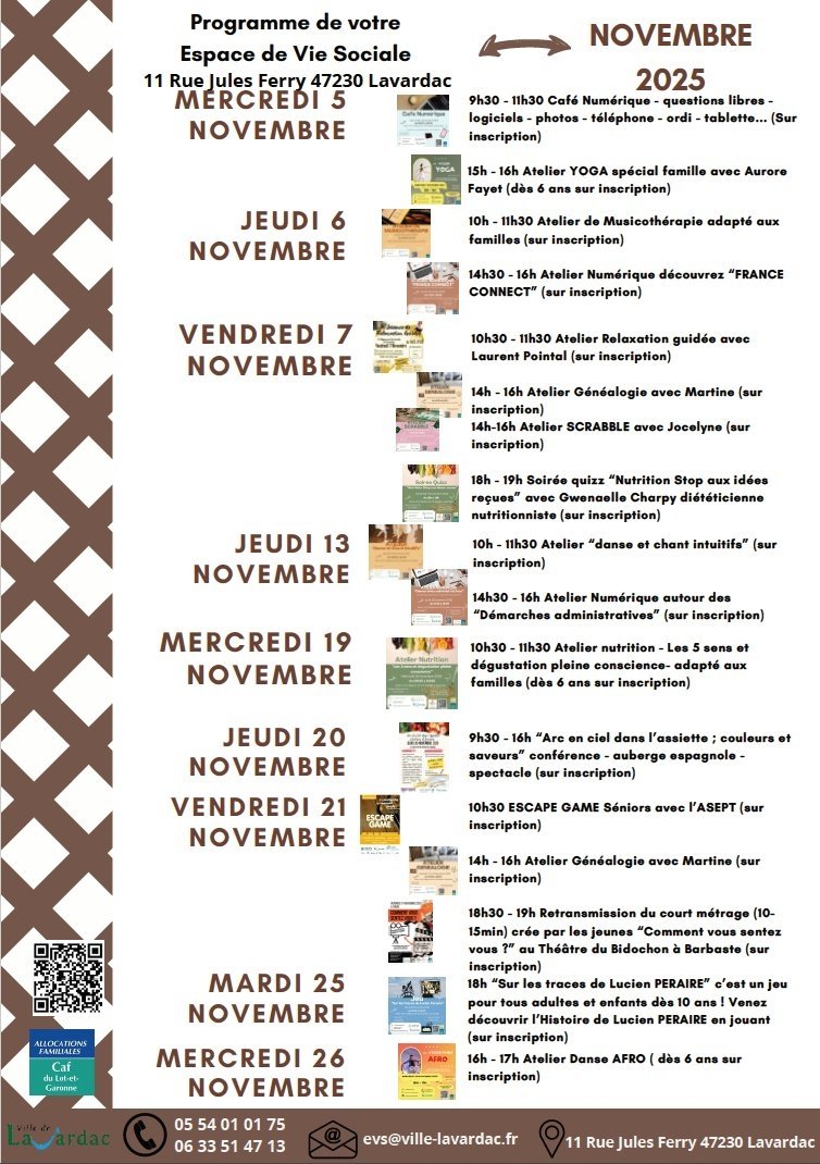 L'Espace de Vie Sociale de Lavardac vous transmet son programme pour le mois de novembre 2025.