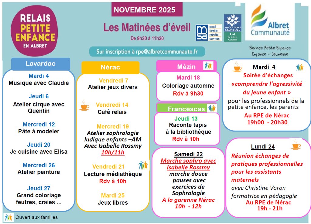 Le Relais Petite Enfance en Albret vous communique le programme du mois de novembre 2025.