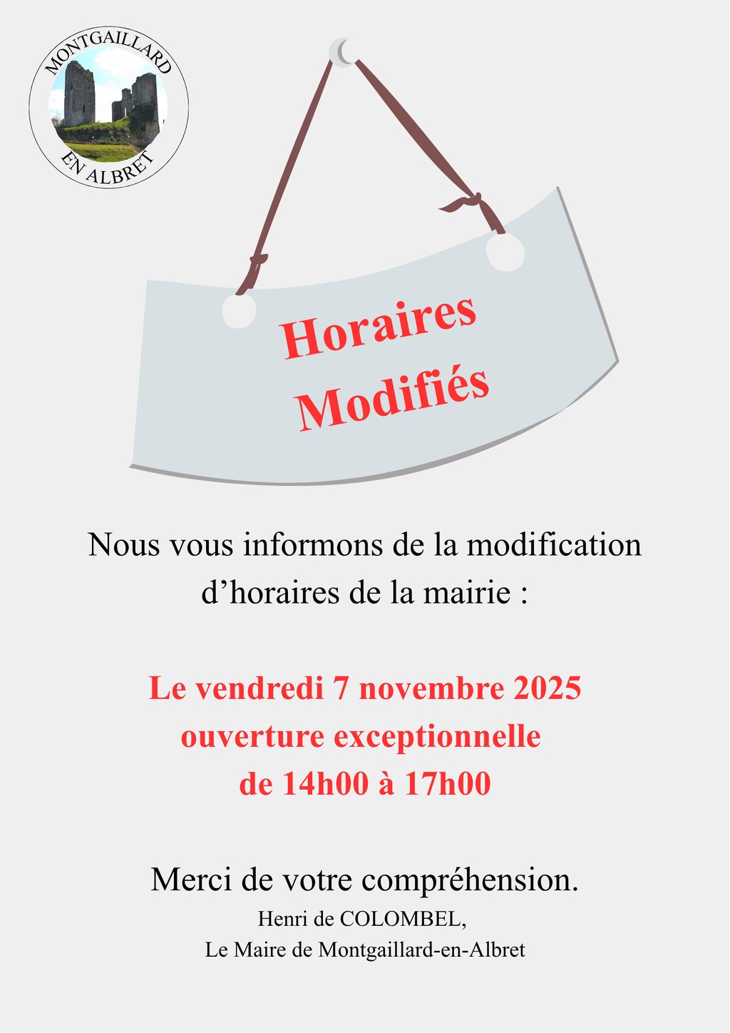 Nous vous informons de la modification d’horaires de la mairie :