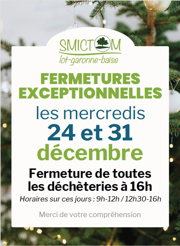 Le SMICTOM LGB vous informe qu’en raison des fêtes de fin d'année, les horaires d'ouverture de l'ensemble des déchèteries sont modifiés pour les mercredis 24 et 31 décembre 2025 comme suit : 9h - 12h et 12h30 - 16h.