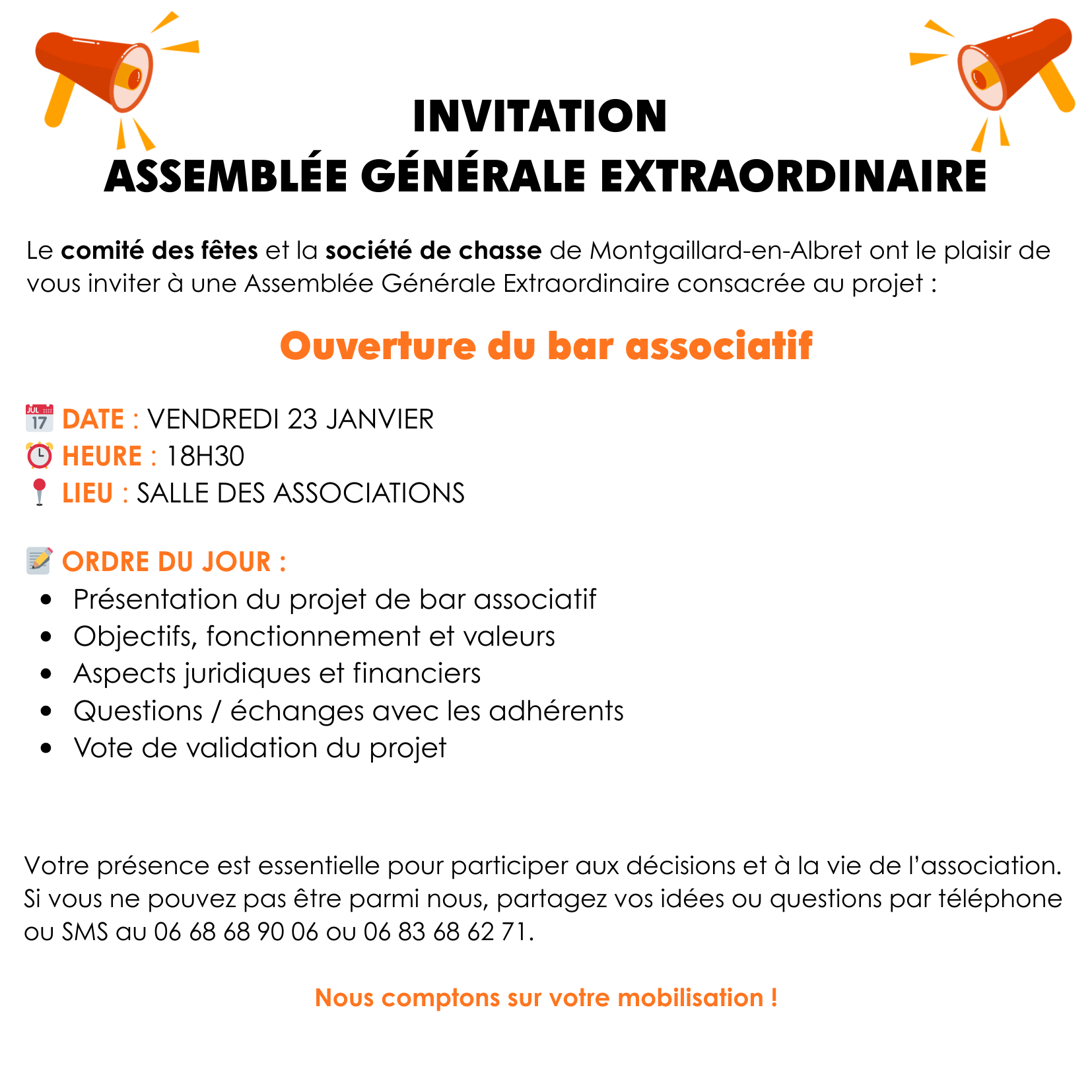 Le comité des fêtes et la société de chasse de Montgaillard-en-Albret ont le plaisir de vous inviter à une Assemblée Générale Extraordinaire consacrée au projet :