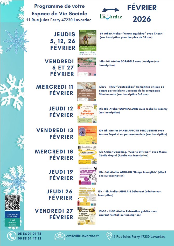 L'Espace de Vie Sociale de Lavardac vous transmet son programme pour le mois de février 2026.