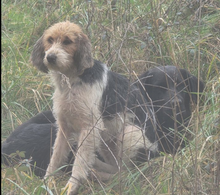 1 chienne type griffon / croisé, poil dur, tricolore (fauve, noir et blanc), oreilles tombantes.