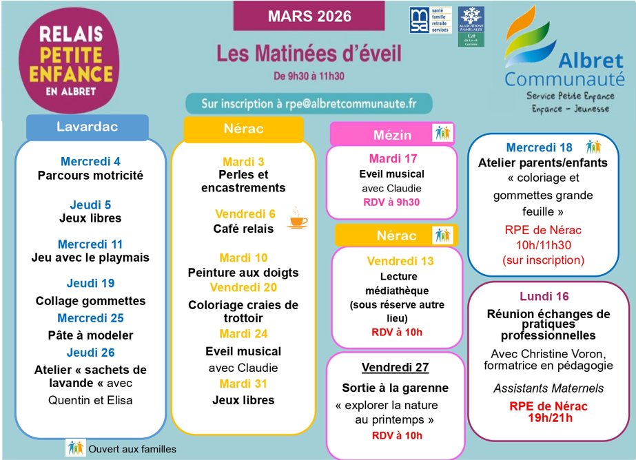 Le Relais Petite Enfance en Albret vous communique le programme du mois de Mars 2026.