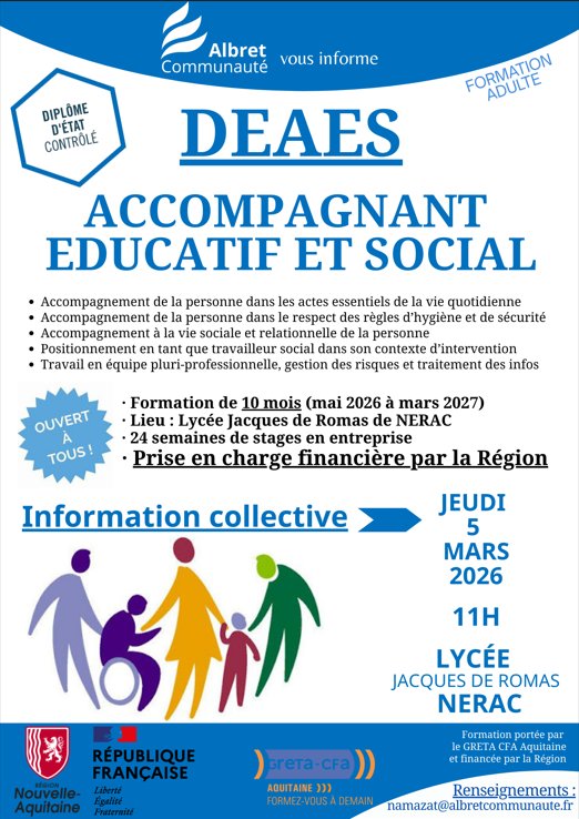 Albret Communauté vous informe d'une réunion collective sur le DEAES : Accompagnant éducatif et social est organisé le jeudi 5 mars 2026 à 11h00 au lycée Jacques de Romas à Nérac.
