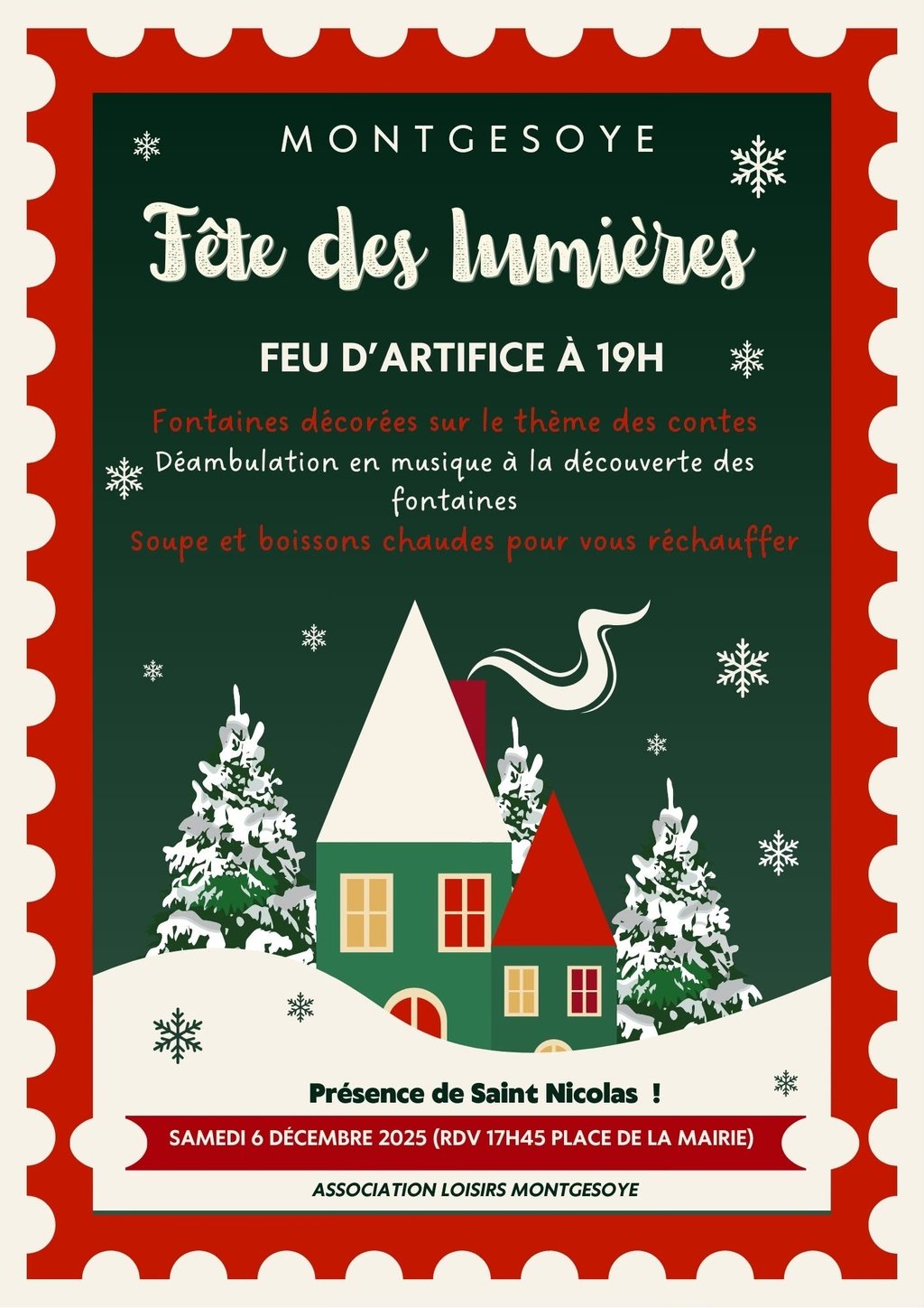 Rendez-vous samedi 6 décembre 2025, à17h45, place de la Mairie, pour la désormais célèbre « fête des lumières » et ses fontaines décorées et illuminées. Feu d'artifice à 19h. Soupe et vin chaud.
