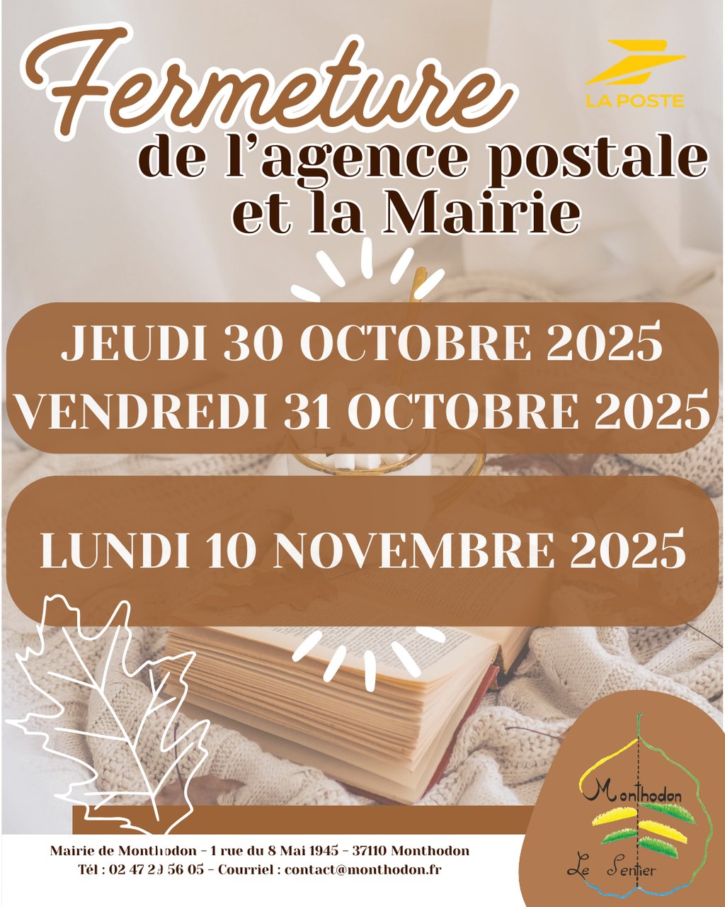 L’agence postale et la mairie de Monthodon seront exceptionnellement fermées :