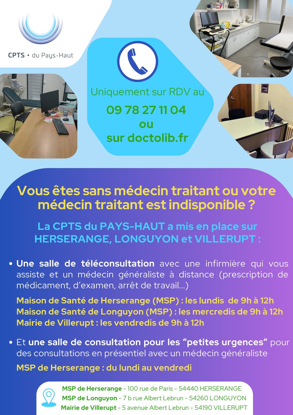 Dans le cadre de l’organisation des soins non programmés et de la téléconsultation portée par la CPTS du Pays-Haut, nous vous informons de deux évolutions importantes :