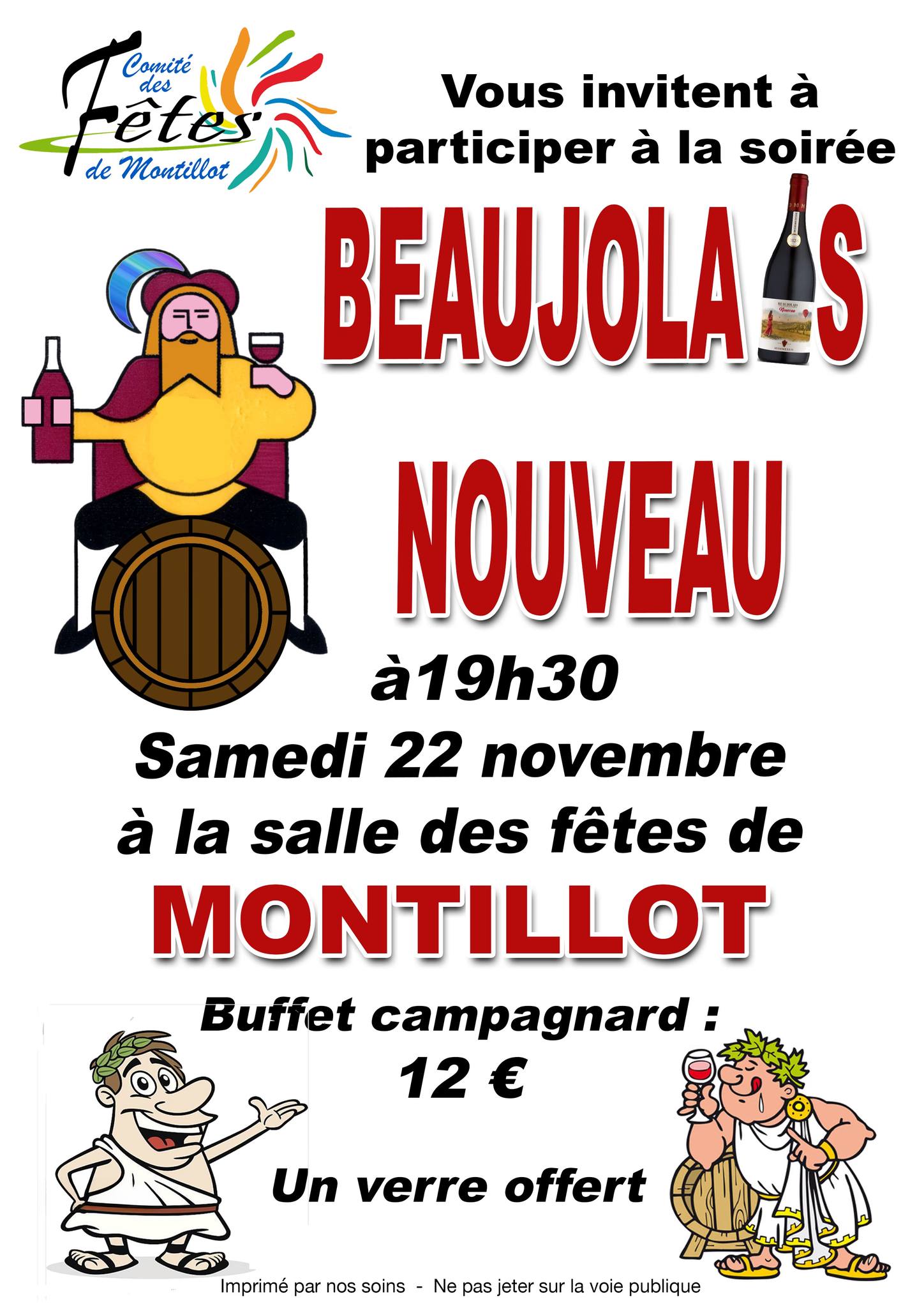 Le comité des fêtes de Montillot vous invite à la soirée du Beaujolais nouveau. Buffet campagnard 12€, un verre offert.