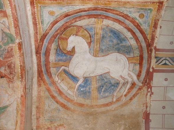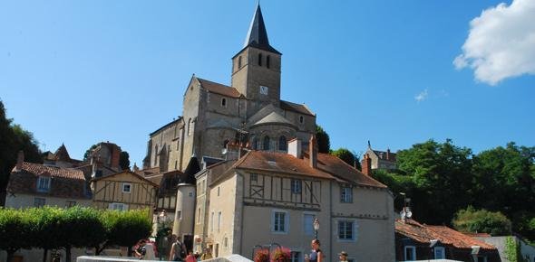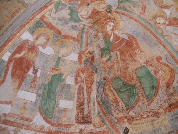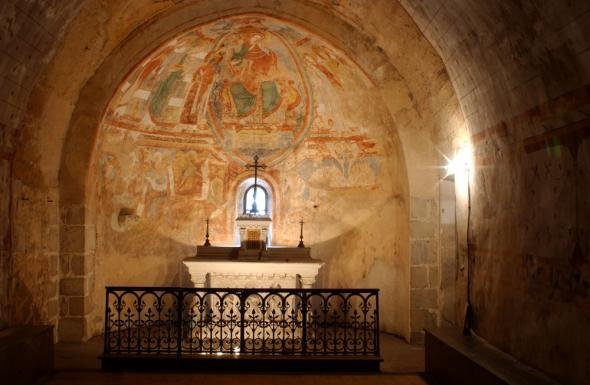Édifiée sur un promontoire rocheux à la fin du 11ème siècle, l’église romane a été reprise à l’époque gothique et a été fortifiée pendant la guerre de Cent Ans. Le joyau de cet édifice se situe dans la crypte Sainte-Catherine. Les peintures murales datées des années 1200 représentent quelques épisodes de la vie légendaire de sainte Catherine d’Alexandrie. De très grande qualité, ces peintures témoignent de l’importance de cette église et illustrent la période de transition entre l’art roman et l’art gothique.
