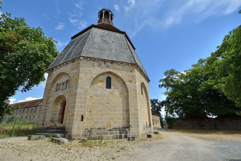 Cet édifice, construit au 12ème siècle dans le cimetière de la Maison-Dieu, avait une double fonction au Moyen Âge. Dans sa partie supérieure, il accueillait une chapelle liée au culte des défunts, et dans sa partie inférieure, l’espace abritait l’ossuaire du cimetière. Les ossements des chrétiens, prélevés régulièrement dans le cimetière, y étaient entreposés dans l’attente de la résurrection promise. La corniche à modillons et le portail occidental présentent de beaux éléments sculptés du 12ème siècle. C’est le monument le plus original du territoire du Montmorillonnais.
