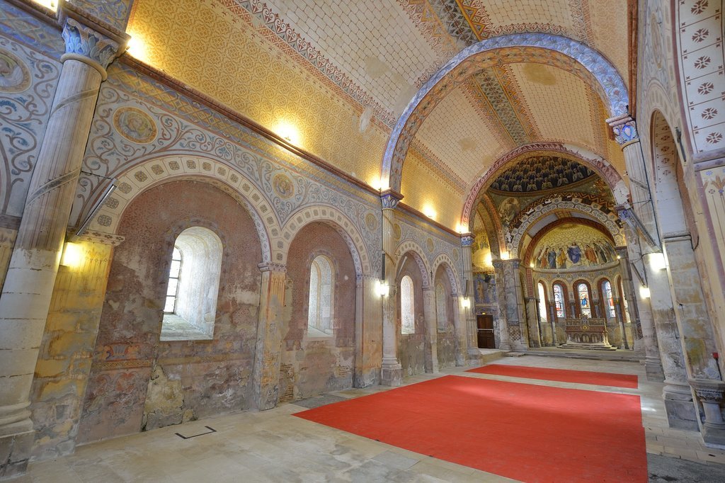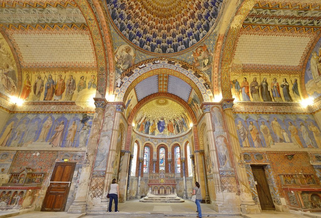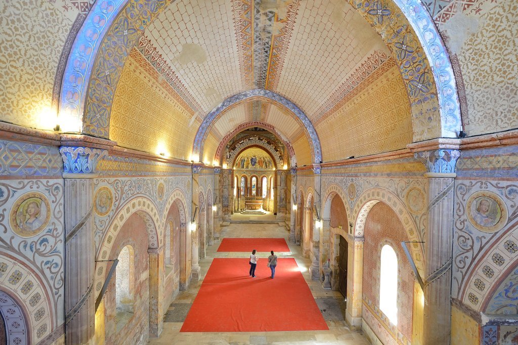 Construite au 12ème siècle, cette église a été transformée au 19e siècle à l’époque où elle est devenue chapelle du petit séminaire. Sa façade du 12ème siècle conserve notamment une très belle frise sculptée évoquant le cycle de l’enfance du Christ. Dans les années 1860, la chapelle reçoit un décor peint impressionnant destiné aux petits séminaristes. Le programme à vocation pédagogique, illustre les fondements de l’Église catholique. La palette de couleurs chatoyantes, la multiplicité des influences artistiques rappellent que le 19ème siècle est un siècle d’éclectisme.