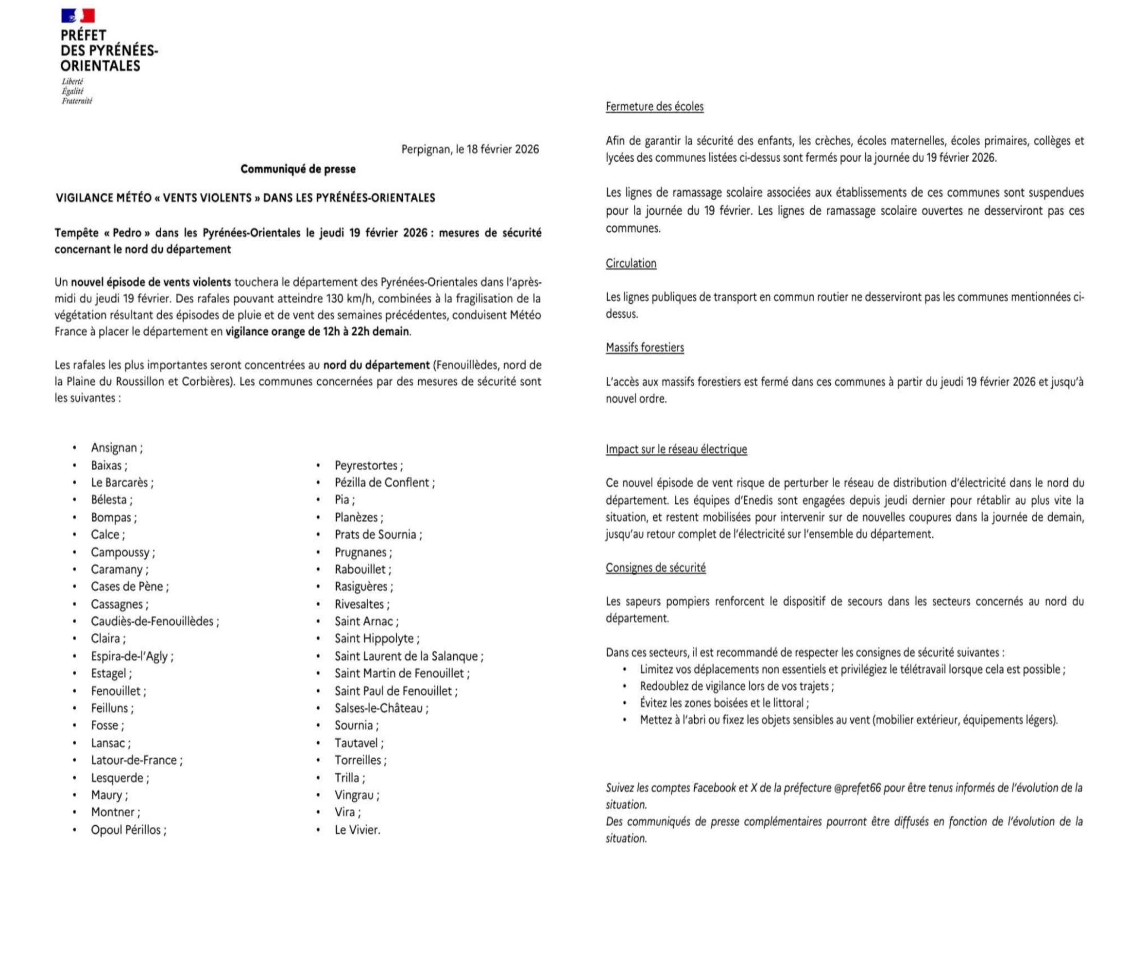 đ Le dĂ©partement des #PyrĂ©nĂ©esOrientales sera placĂ© en vigilance orange « vent violent » le jeudi 19 fĂ©vrier de 12h00 Ă 22h00.