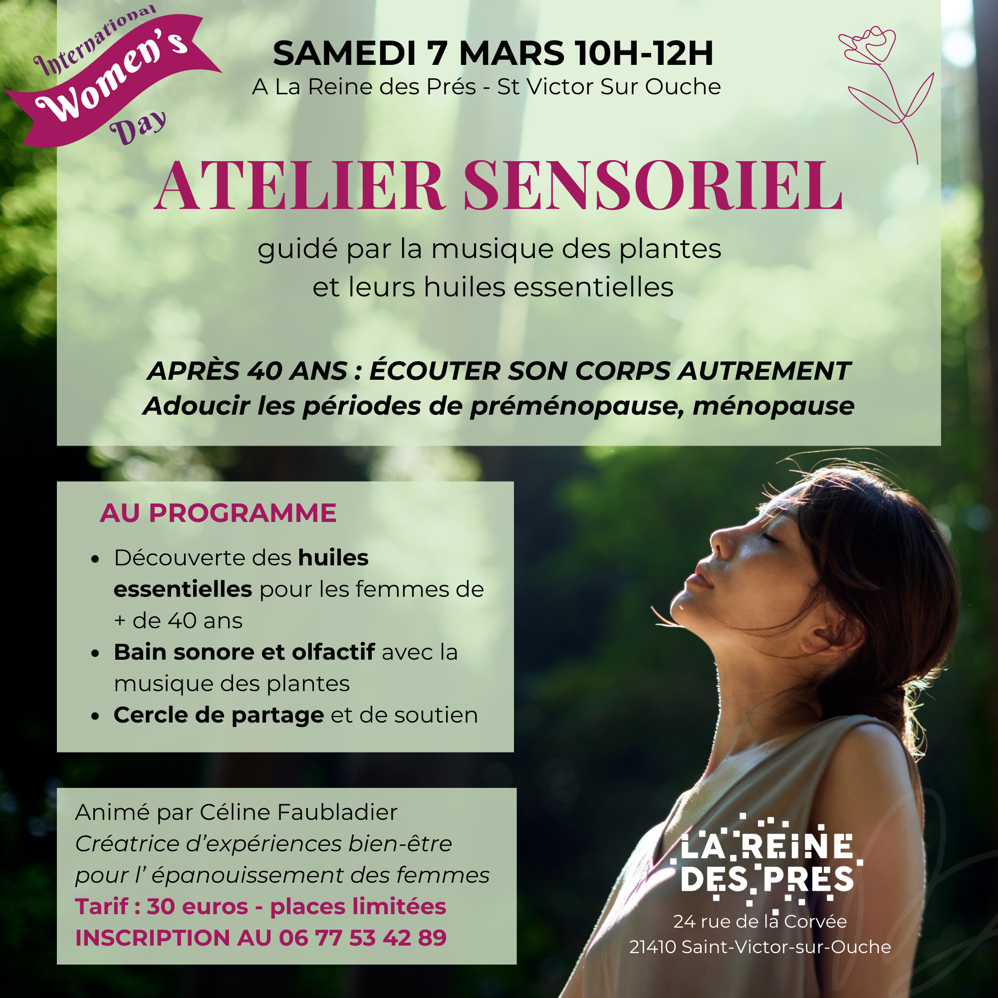 Un atelier proposé le samedi 7 mars 10h-12h à l'espace "La Reine des Prés" à Saint-Victor-sur-Ouche et animé par Céline Faubladier - Ecrin de Gaïa, créatrice d'expériences bien-être pour l'épanouissement des femmes.