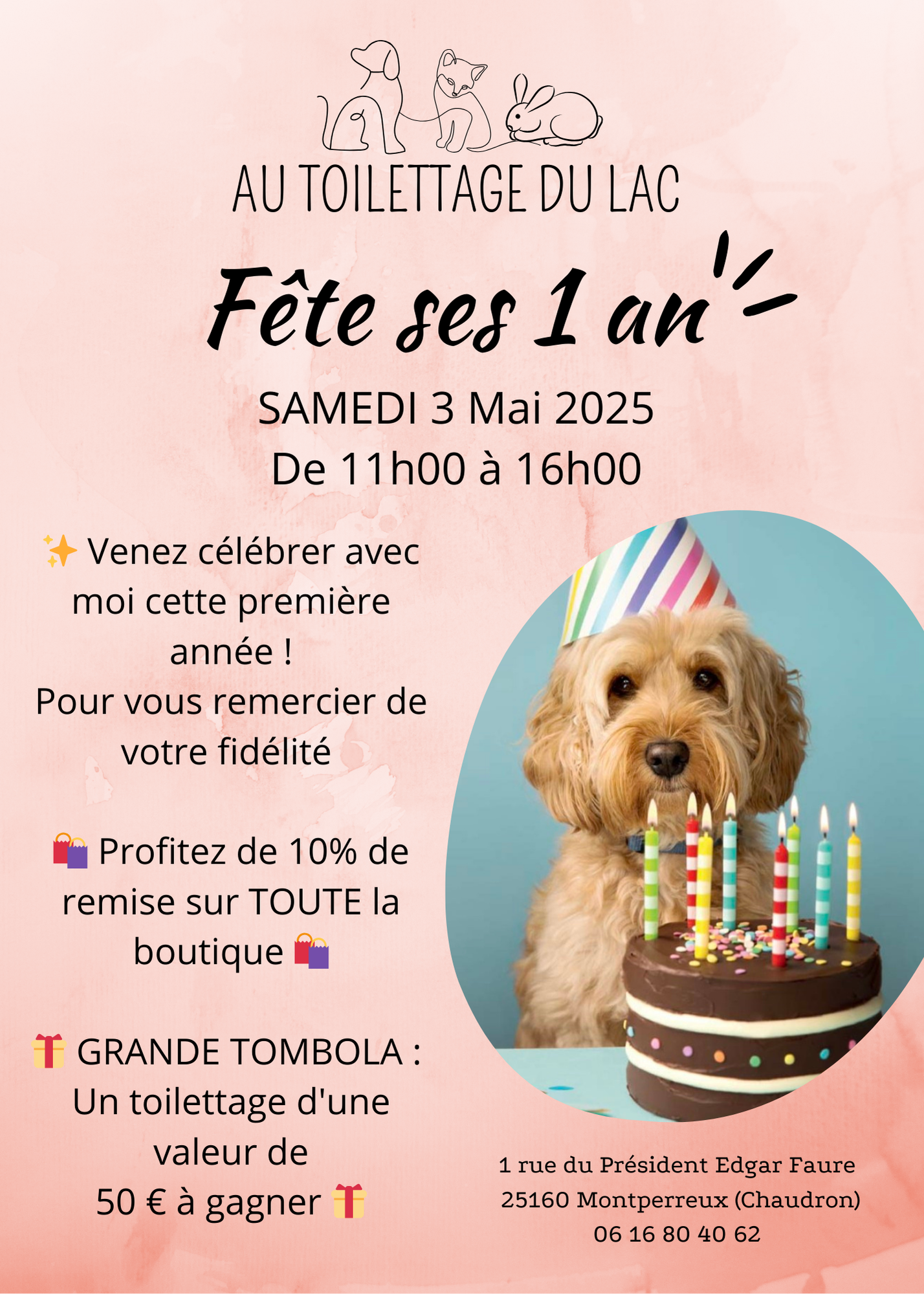 Votre salon Au Toilettage Du Lac fête son 1er ANNIVERSAIRE le 3 Mai ! 🎉