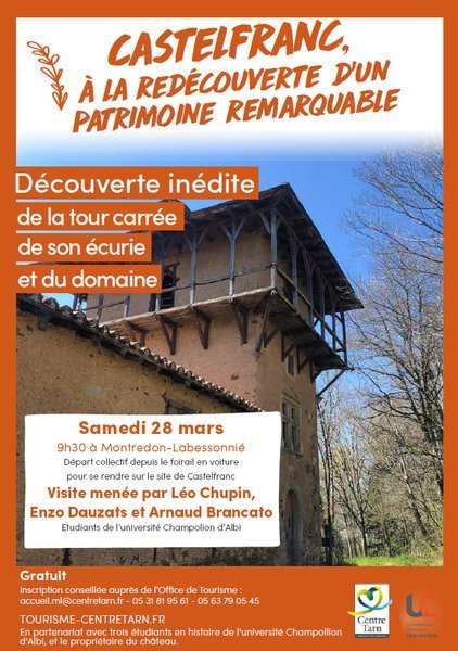 Une visite commentée du Belvédère et du domaine de Castelfranc vous sera proposée par trois étudiants de l'université Champollion d'Albi en partenariat avec l'Office de tourisme du Centre Tarn et le propriétaire du château. Elle se tiendra le samedi 28 mars, le départ se fera depuis le foirail de Montredon-Labessonnié à 9h30 et se poursuivra en voiture jusqu'au site (3km). La visite sera ouverte gratuitement à tous les intéressés, curieux d'en apprendre davantage sur le domaine de Castelfranc, avec une ouverture exceptionnelle de la chapelle et d'une partie du château, habituellement fermés.