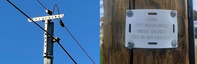 - Sur les poteaux télécoms, le câble de cuivre est toujours positionné sur la partie inférieure du poteau. Le câble de fibre est positionné sur la partie supérieure du poteau, très souvent sur une petite extension métallique en tête de poteau (cf photo N° 1).