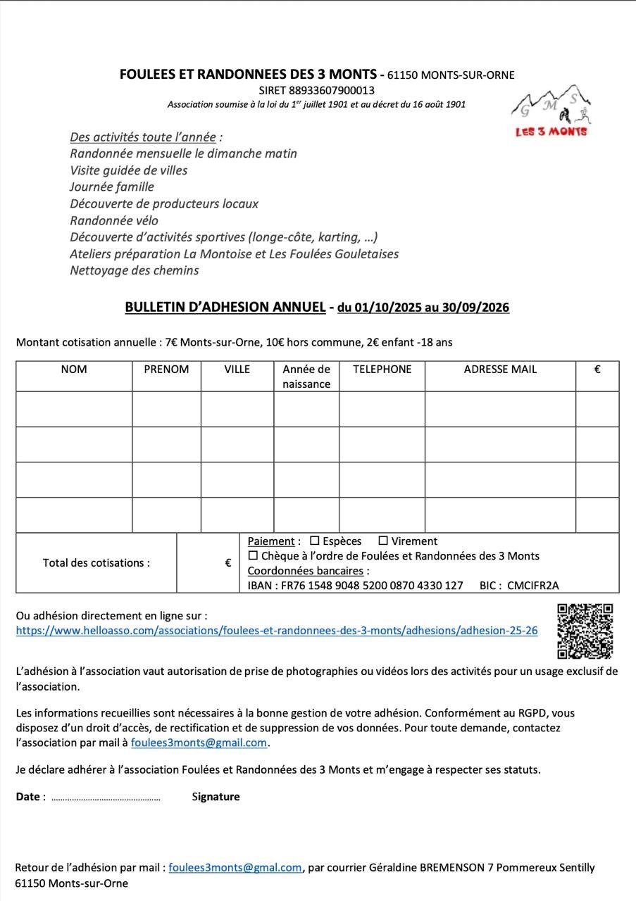 ADHÉSION FOULÉES ET RANDONNÉES DES 3 MONTS
