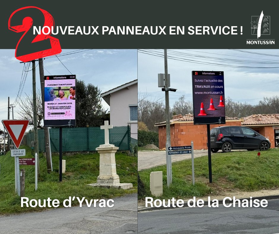 Les panneaux lumineux route d’Yvrac et route de la Chaise sont désormais mis en service (après validation réglementaire).