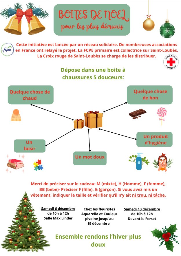 ➡ La FCPE primaire se propose d’être "LE POINT COLLECTE" des Boîtes de Noël pour les plus démunis à Saint-Loubès et ses environs pour la 6ème année consécutive.🎁