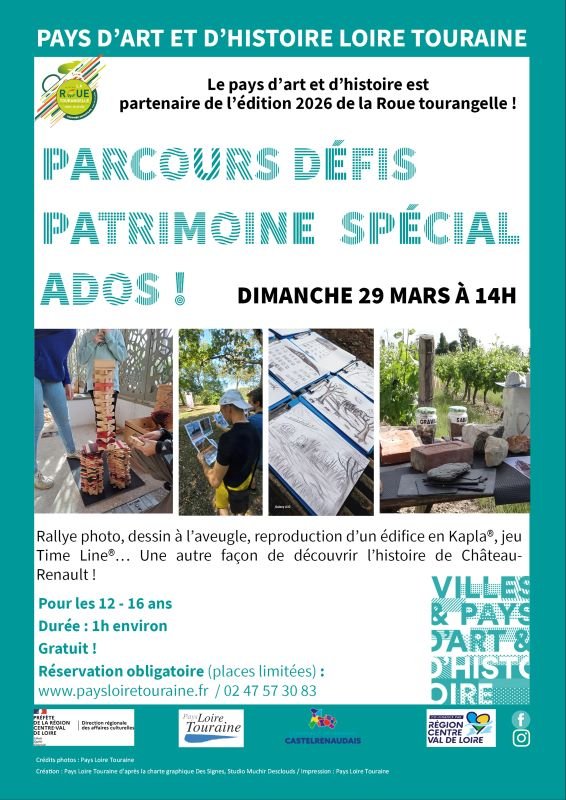 Vous cherchez une idée de sortie pour votre ado (12-16 ans) ? Rendez-vous avec le Pays Loire Touraine à Château-Renault le 29 mars, pour une sortie ludique autour du patrimoine : rallye photo, dessin à l’aveugle, Kapla, Time Line… pour découvrir l’histoire autrement !