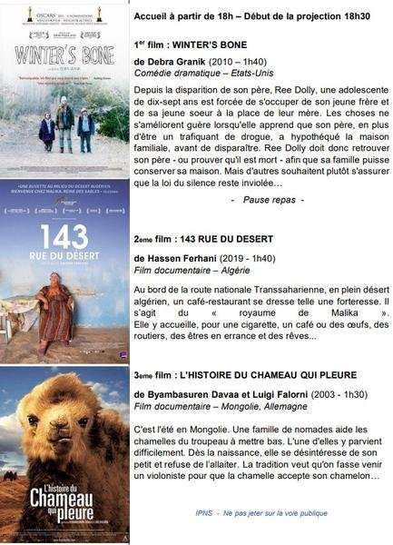 Soirée cinéma, avec trois films projetés et un repas.