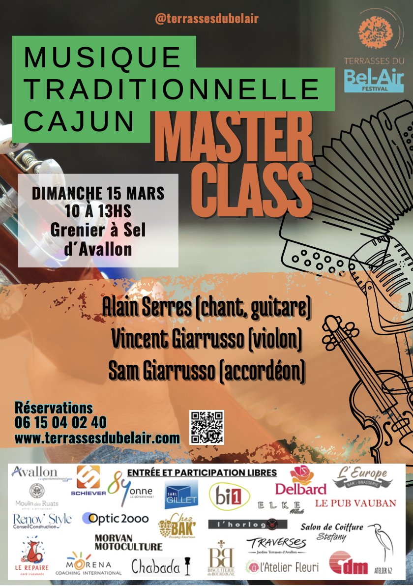 Dans le prolongement du concert, le dimanche 15 mars de 10h à 13h, le Grenier à Sel d'Avallon accueillera une masterclass animée par Alain Serres à la guitare. Une rencontre musicale à destination des musiciens intéressés par la musique franco-louisianaise, ses rythmes, ses répertoires et ses modes de jeu, dans un esprit de partage et de transmission. Un temps dédié aux musiciens amateurs, accessibles à tous, sans prérequis.