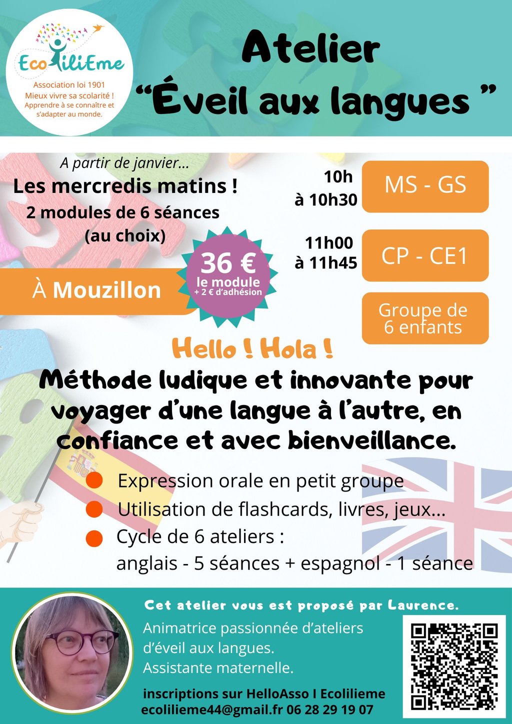 À Mouzillon Holà, Hello, Salut ! Cycle de 6 ateliers : anglais - 5 séances + espagnol - 1 séance. Avec Laurence, ose t'exprimer en petit groupe en jouant !