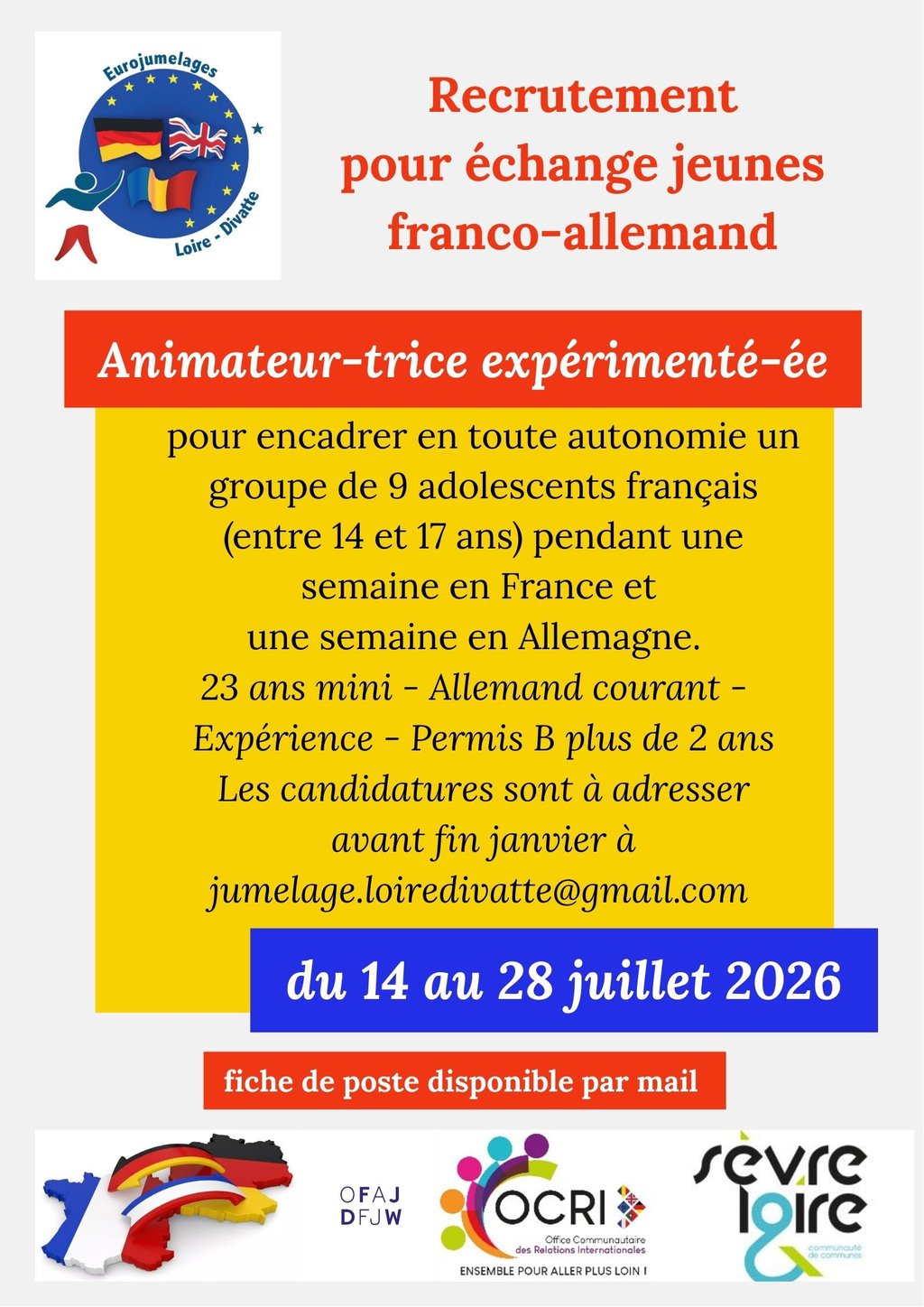 L’association Eurojumelages Loire-Divatte recherche un animateur ou une animatrice avec expérience pour encadrer 9 adolescents français pendant l’échange franco-allemand qui se déroulera du 14 au 28 juillet 2026.