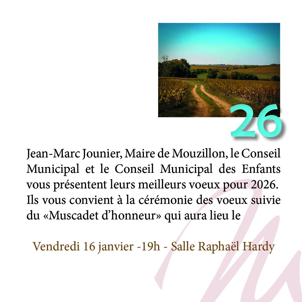 Jean-Marc Jounier, Maire de Mouzillon, le Conseil Municipal et le Conseil Municipal des Enfants vous présentent leurs meilleurs vœux pour 2026.
