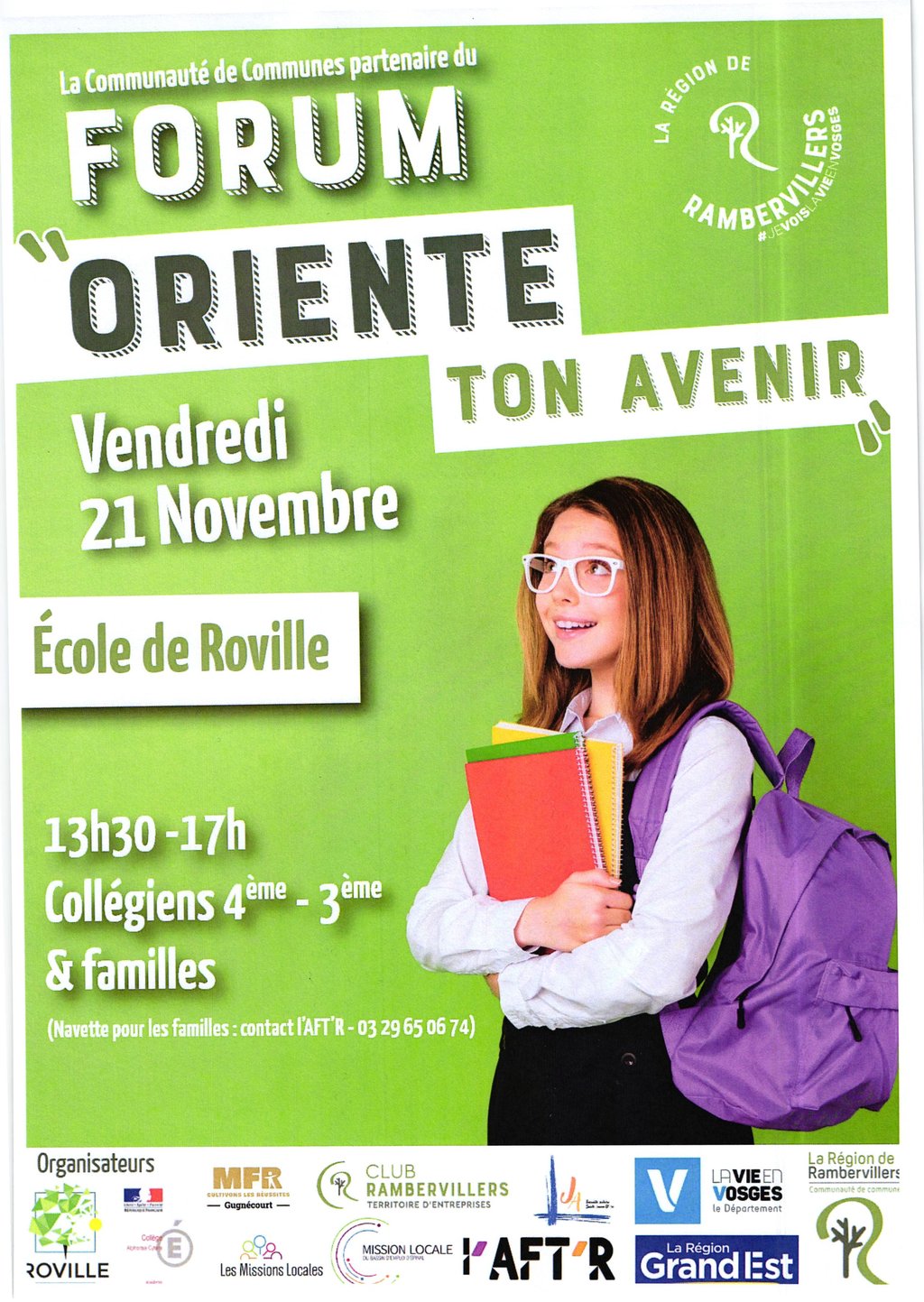 La Communauté de communes de la région de Rambervillers, le club d’entreprise de Rambervillers, les collèges Alphonse Cytère et Jeanne d’Arc, l’association des familles du territoire de Rambervillers, ROVILLE, la MFR de Gugnécourt et la Mission Locale du bassin d’emploi d’Épinal ont le plaisir de vous inviter au forum "Oriente ton avenir", qui se tiendra :