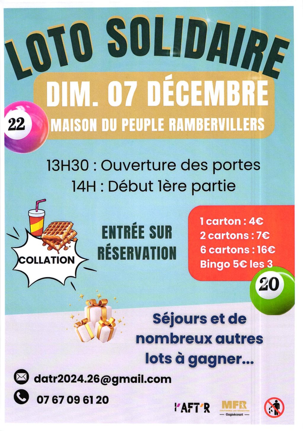 Le groupe de jeunes de l’association « Les Créateurs de Solidarité » de la MFR-CFR de Gugnécourt organise prochainement un Loto ouvert à tous, le dimanche 7 décembre 2025 à la Maison du Peuple de Rambervillers, à partir de 13h30.