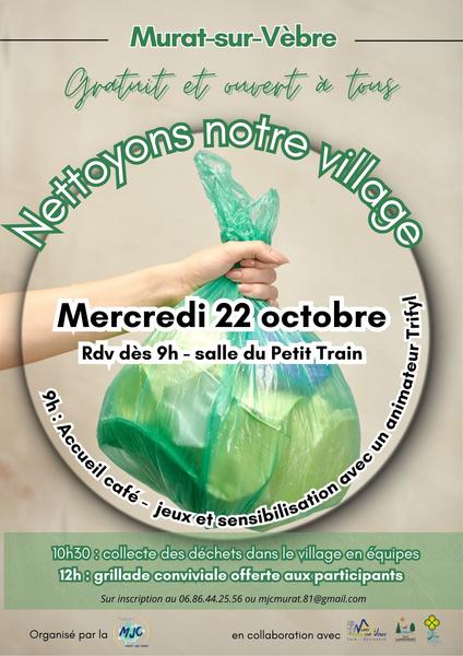 La MJC de Murat, en partenariat avec la mairie, la communauté de communes et Trifyl, propose une matinée "village propre". Au programme : accueil café - jeux et sensibilisation au tri des déchets - repas convivial pour remercier les participants