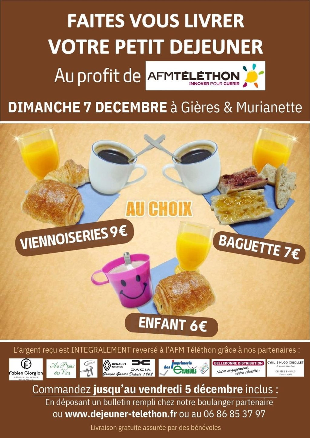 Les communes de Ville de Murianette et Ville de Gières vous proposent avec l'aide de bénévoles de commander vos petits-déjeuners au profit du Téléthon.
