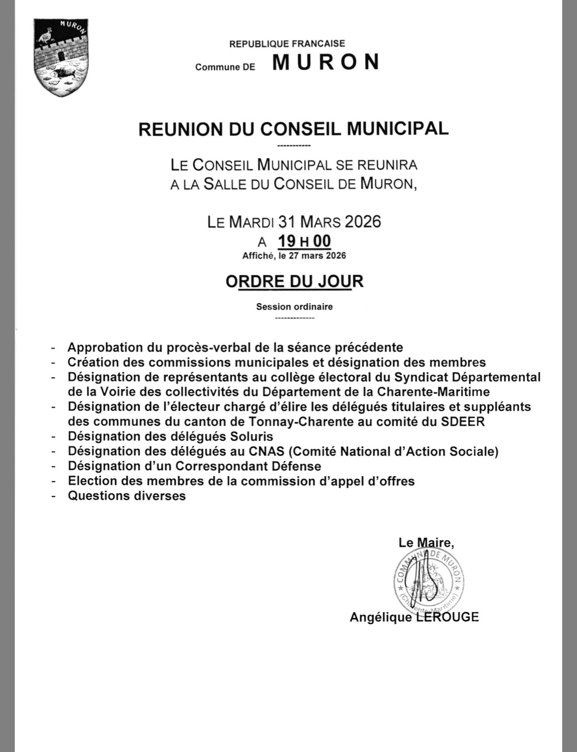 Réunion du conseil municipal mardi 31 mars 2026 à 19 h