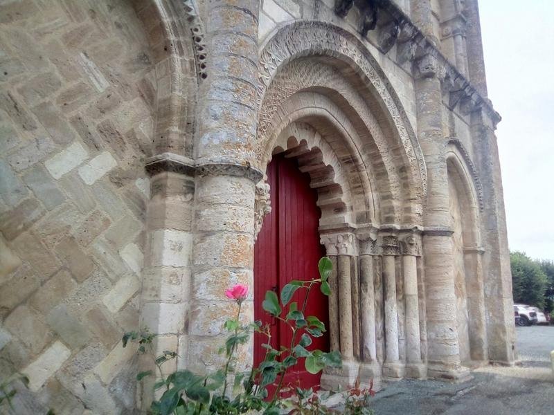 Le portail présente plusieurs voussures sculptées. Celle du bas retombe sur des colonnettes à chapiteaux ornés de feuillages et de figures.