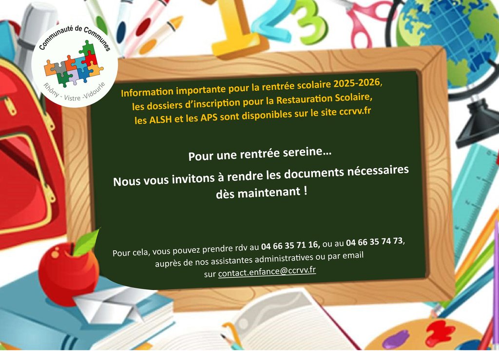 Les dossiers d'inscription de l'année 2025-2026 pour la Restauration scolaire, les Accueils de loisirs et les Accueils périscolaires sont disponibles sur le site de la CCRVV (lien : https://www.ccrvv.fr/.../formulaire.../dossier-d-inscription)