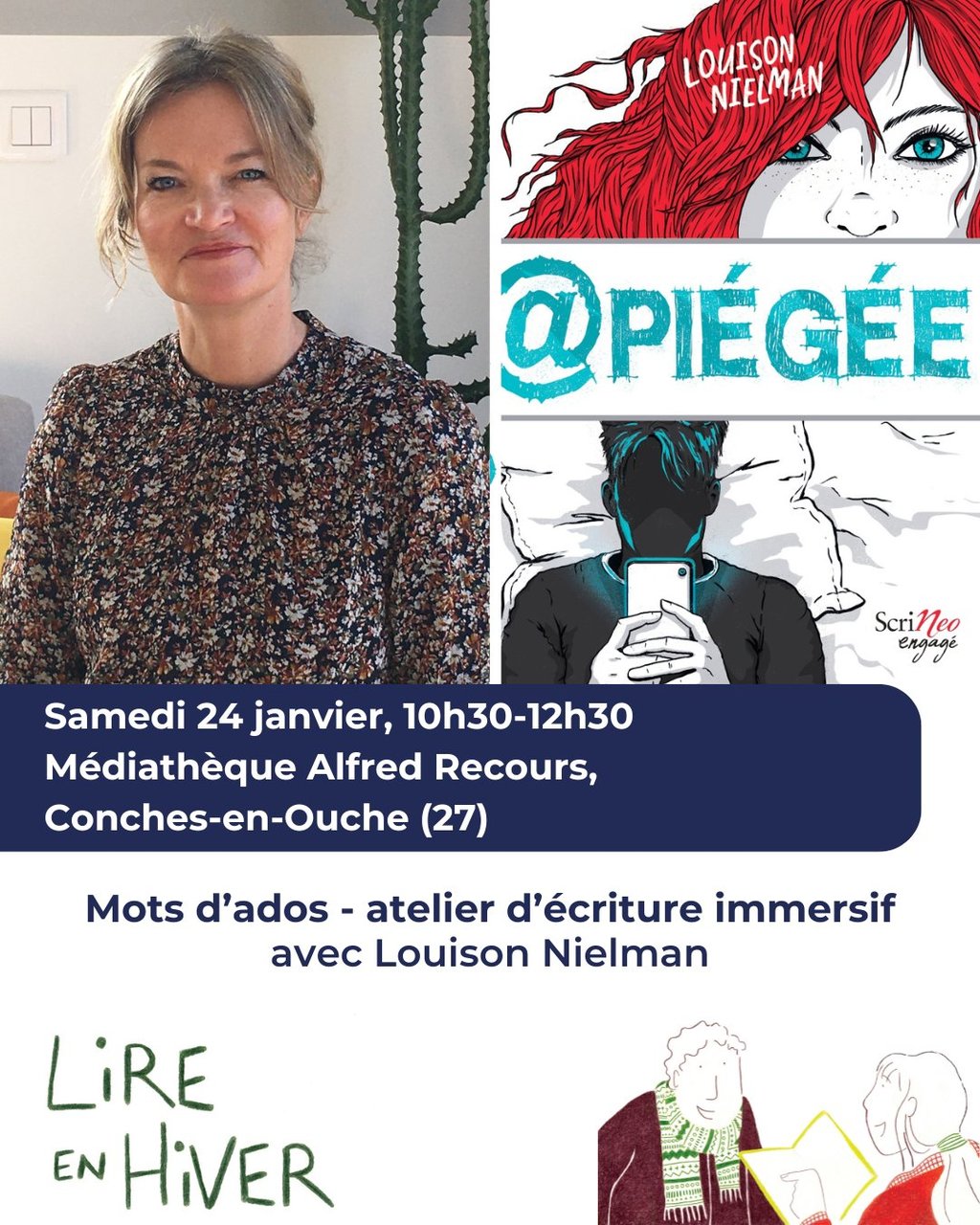 Autour de son dernier roman @piégée qui met en scène Alba une jeune collégienne et son grand frère Charly, Louison Nielman propose un atelier d’écriture immersif sur l’adolescence, pour explorer cette période charnière, pleine de métamorphoses et d’émotions.