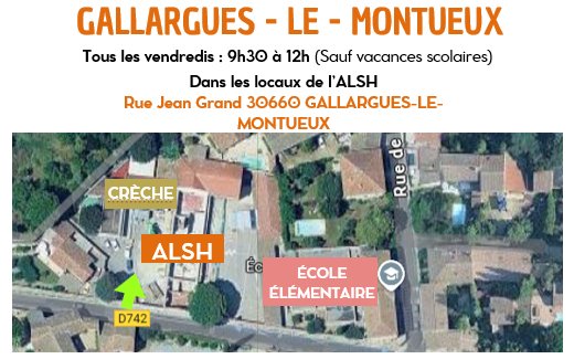 📍RDV dans les locaux maternels de l'Accueil de loisirs de Gallargues-le-Montueux à côté du bâtiment de la Crèche intercommunale "À Petits pas" : Rue Jean Grand 30660 Gallargues-le-Montueux (voir lien ci-dessous).