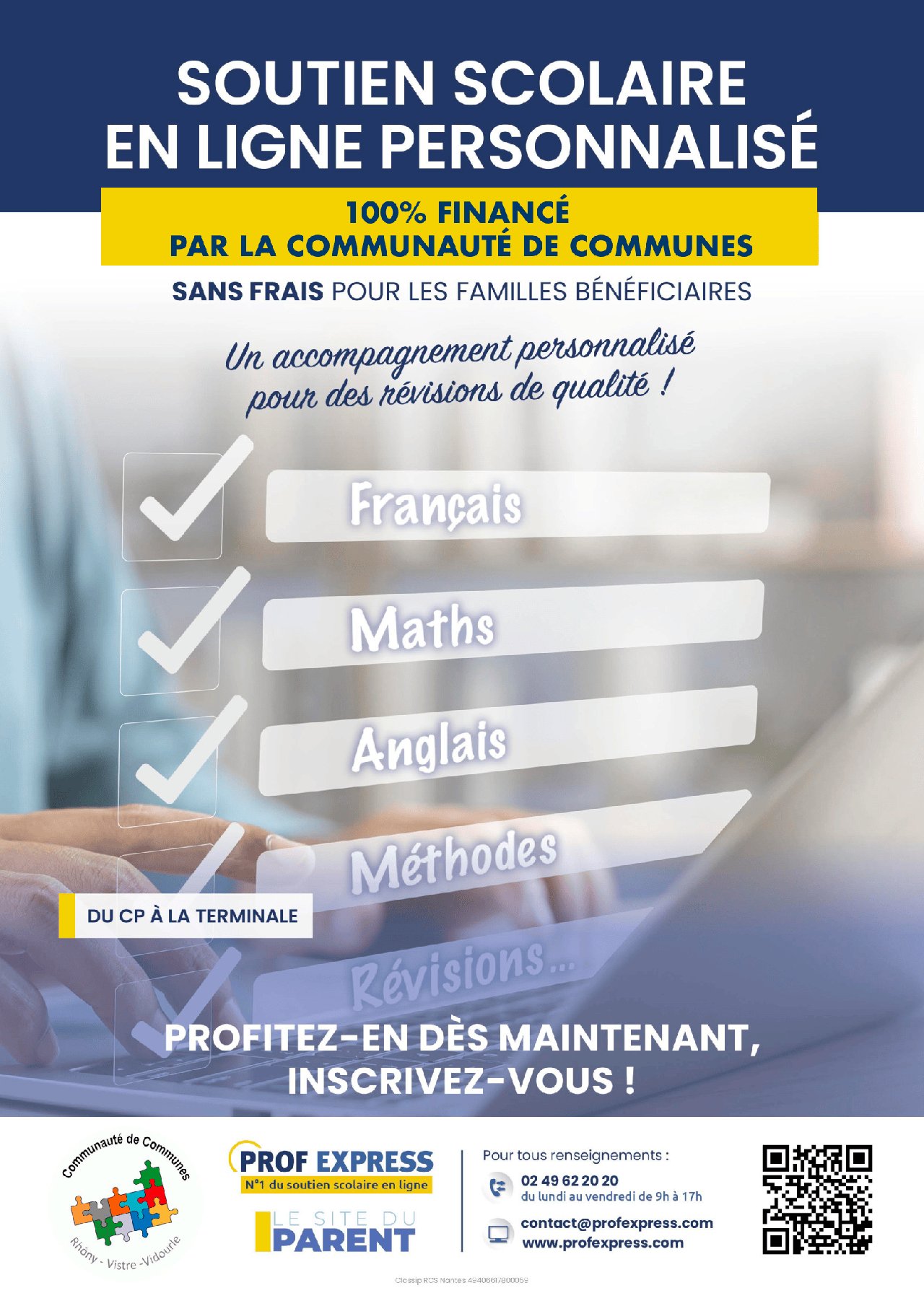 👩🎓 Depuis la rentrée de septembre 2025, tous les enfants qui résident sur le territoire de la Communauté de Communes Rhôny-Vistre-Vidourle (CCRVV), scolarisés du CP à la Terminale, ainsi que leurs parents, bénéficient d’un accès illimité et entièrement gratuit à la plateforme PROF EXPRESS.