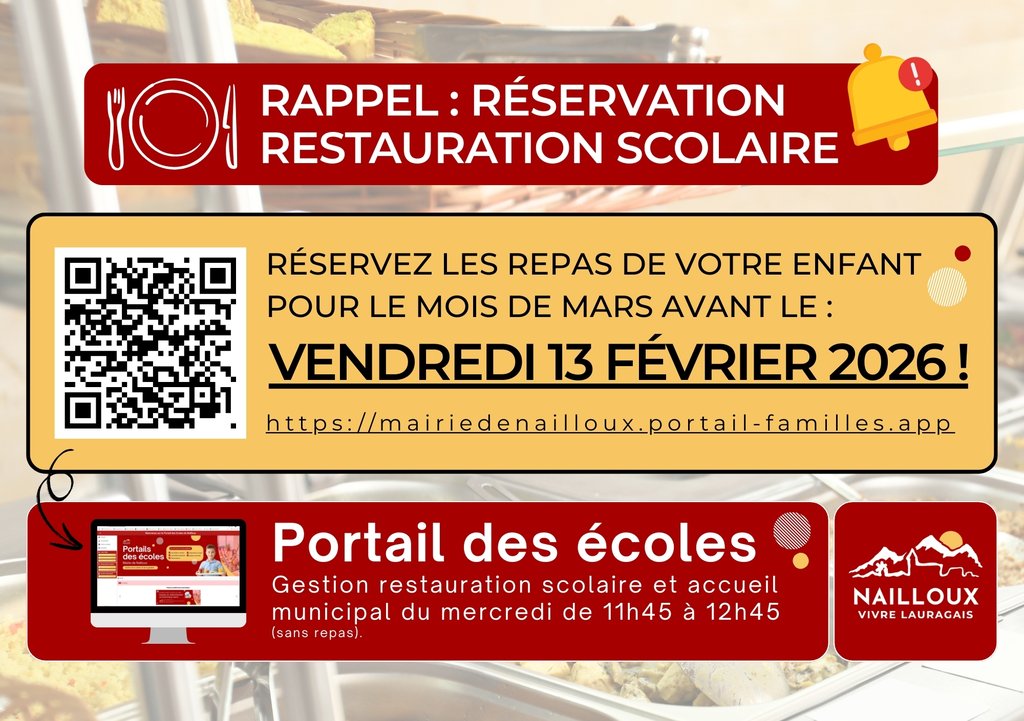 Pensez à réserver les repas de votre enfant pour le mois de Mars : Vous avez jusqu’au Vendredi 13 février pour effectuer votre réservation. Rendez-vous directement sur le portail des écoles : https://mairiedenailloux.portail-familles.app/