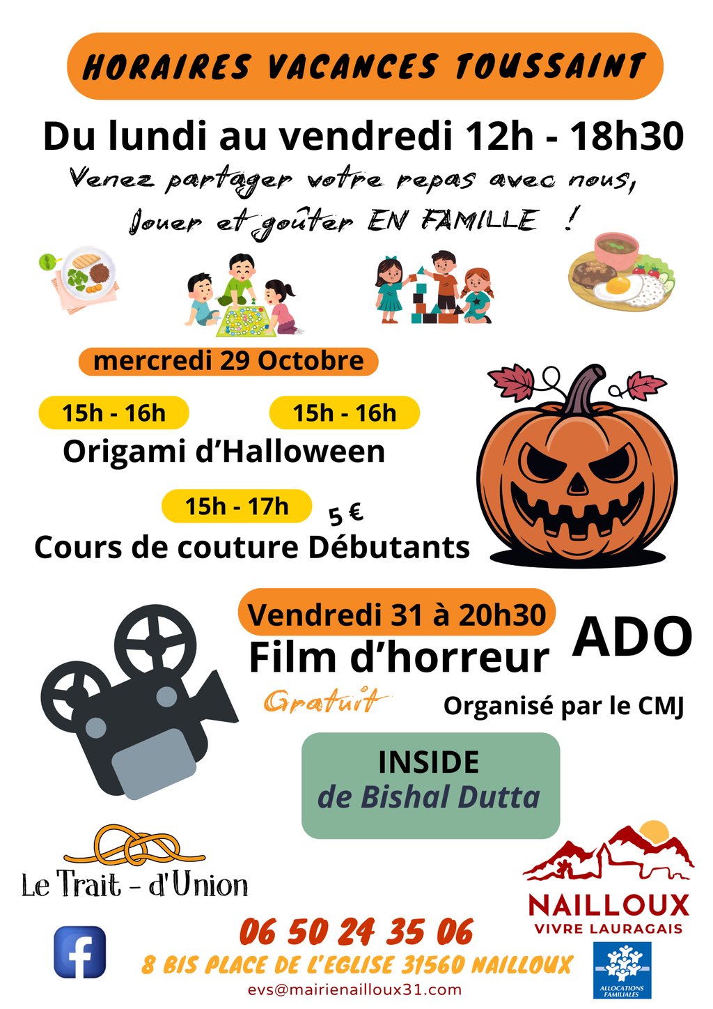 Et n'oubliez pas le film d'Halloween pour Ados vendredi à 20h30 soirée organisée par le conseil Municipal des jeunes de Nailloux ! Frayeur garantie ! 🎃